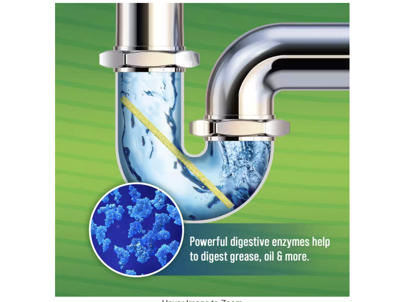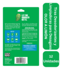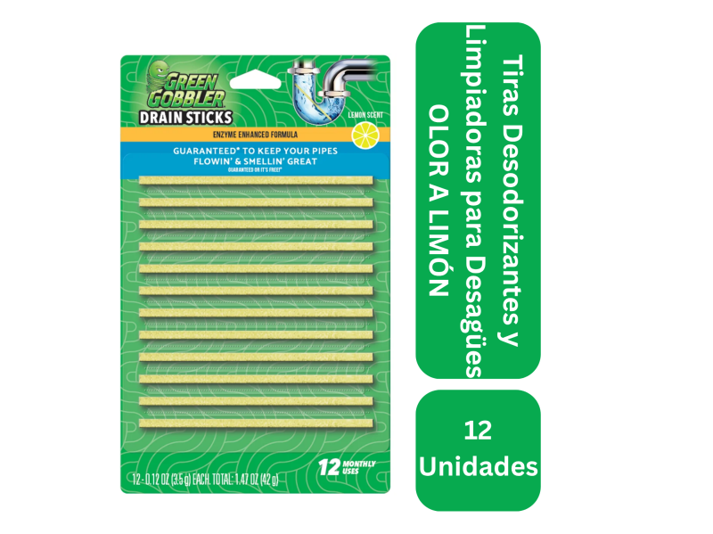Tiras Bio-Flow con aroma a limón para limpieza y desodorización de desagües. Disuelven grasa y residuos con enzimas naturales. Paquete con 12 unidades para uso mensual.